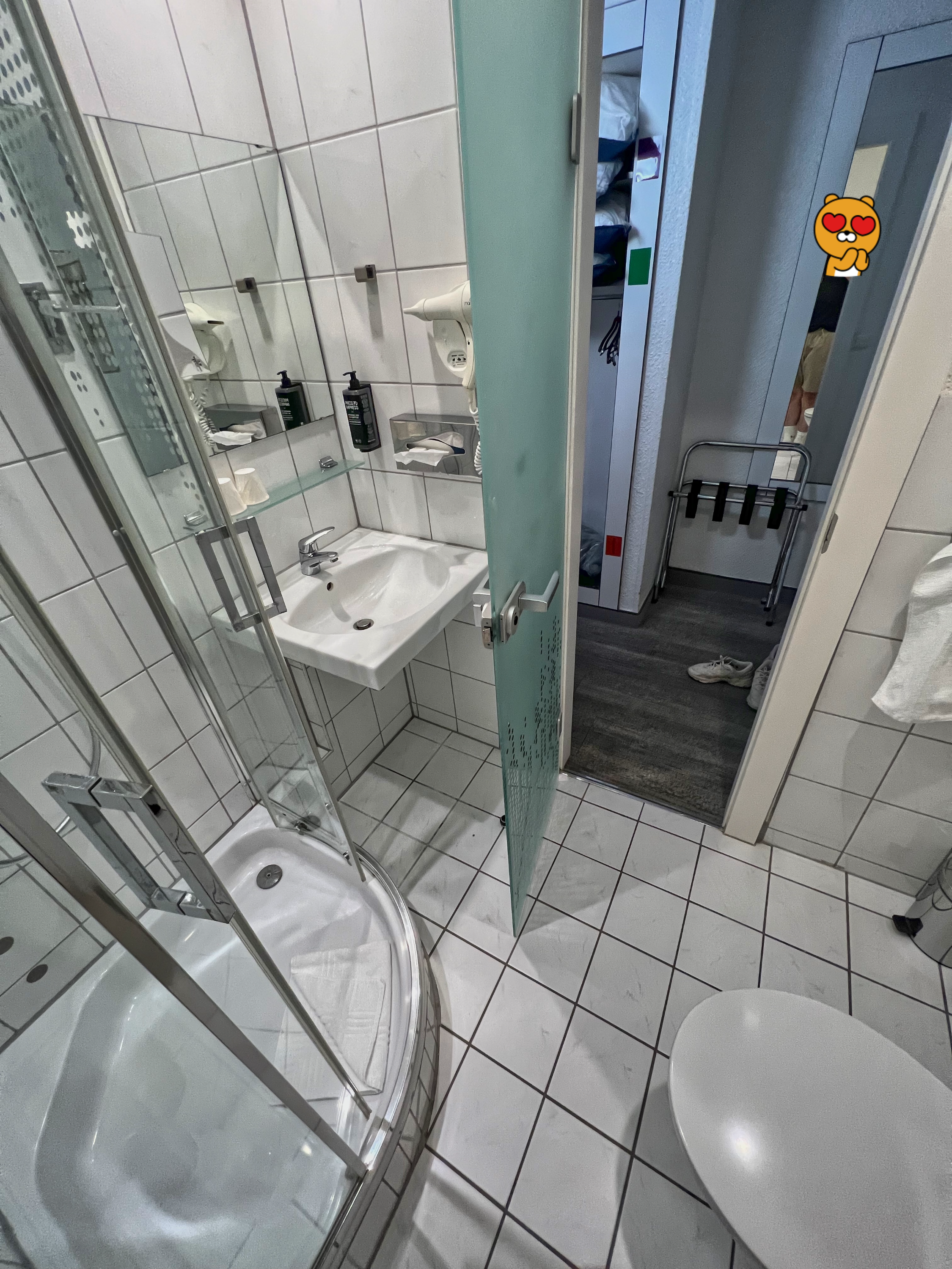 그리고 화장실입니다. 화장실 역시 작았는데요. 나쁘지 않았습니다. 샤워부스도 있고, 올인원이긴 하나 샴푸, 바디워시, 트리트먼트도 있었고요. 종이컵도 개별 포장(?)이 되어 있었습니다. 칫솔은 없었던 것으로 기억합니다. 챙겨가세요!